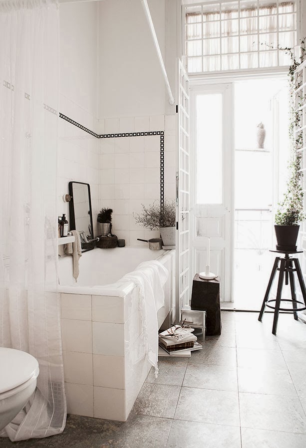 Last week I had a lovely comment from one of you asking to see more bathrooms and your wish is my command! This beautiful black and white bathroom was recently photographed by Skåne based Daniella Witte. It's the perfect mix of old school and modern day industrial with a hint of romantic. I love the retro black square pattern boarder used to break up the white. Such a lovely bathroom.